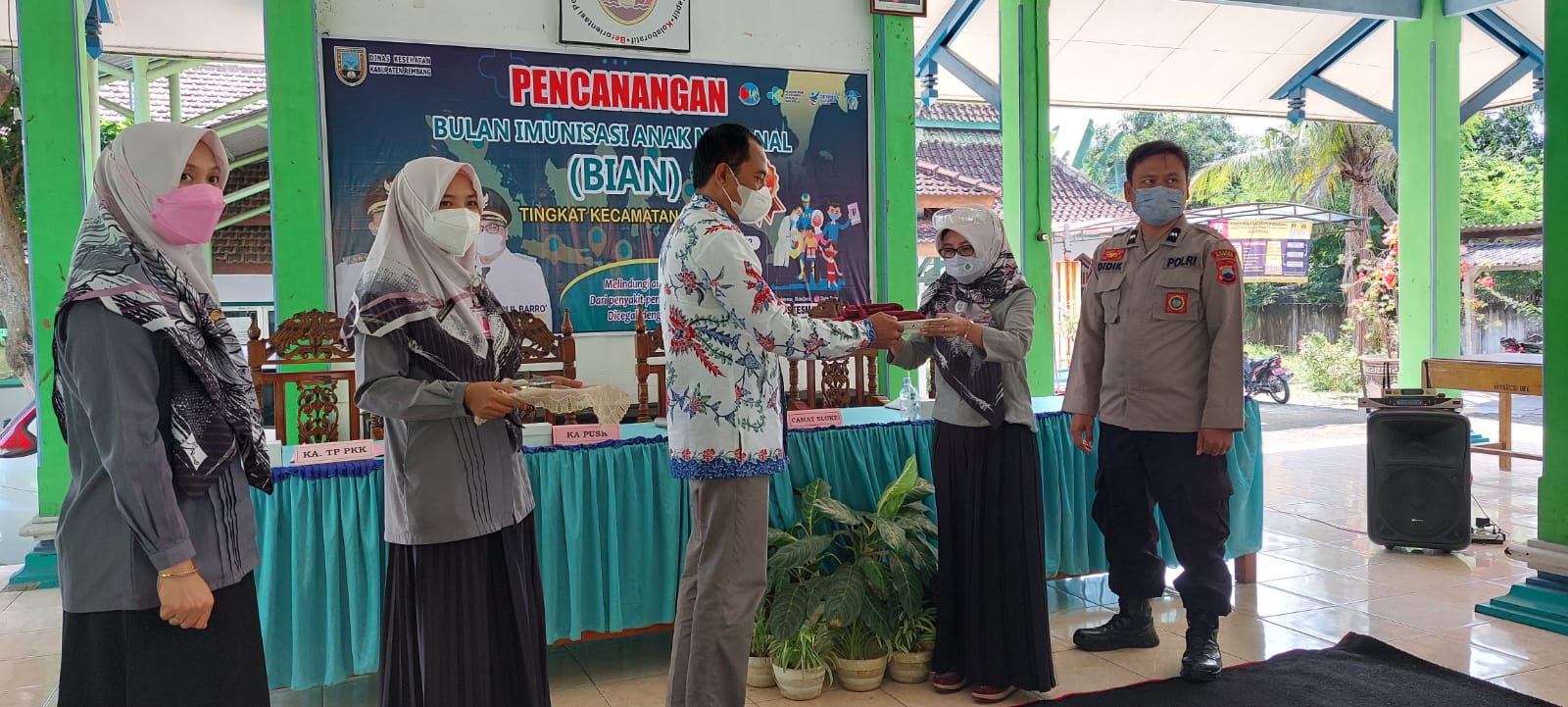 Pencanangan Bulan Imunisasi Anak Nasional (BIAN) tingkat Kecamatan Sluke yang ditandai dengan pemotongan pita oleh Bapak Camat Sluke sebagai langkah awal dalam merealisasikan program imunisasi. Kegiatan yang terlaksana di Pendopo Kecamatan Sluke tersebut berjalan tertib dan lancar.